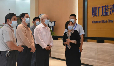 廈門藍(lán)灣科技董事長林秀芬(前排右1)向廈門市關(guān)工委副主任黃家列(前排左3)、廈門市關(guān)工委副秘書長蔡水妙(左1)、廈門市海滄區(qū)關(guān)工委執(zhí)行主任李大輝(左2)等介紹藍(lán)灣在海洋多糖科技的創(chuàng)新發(fā)展情況。